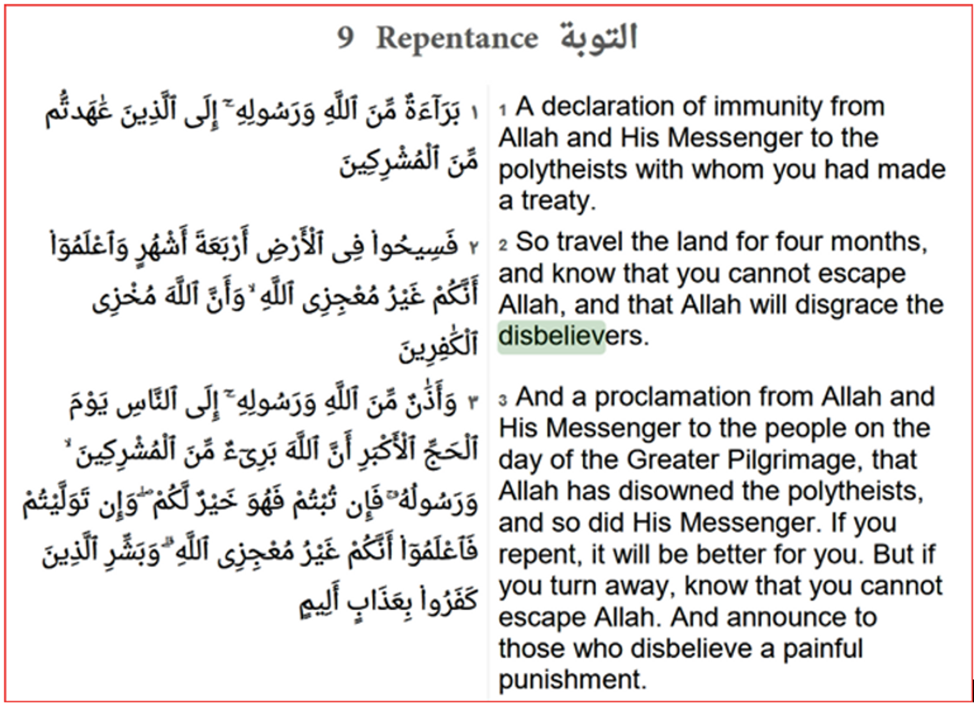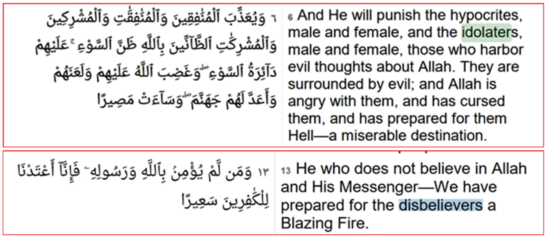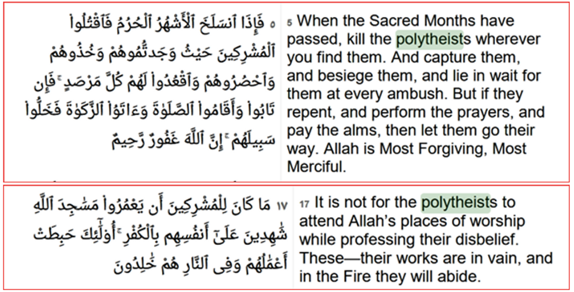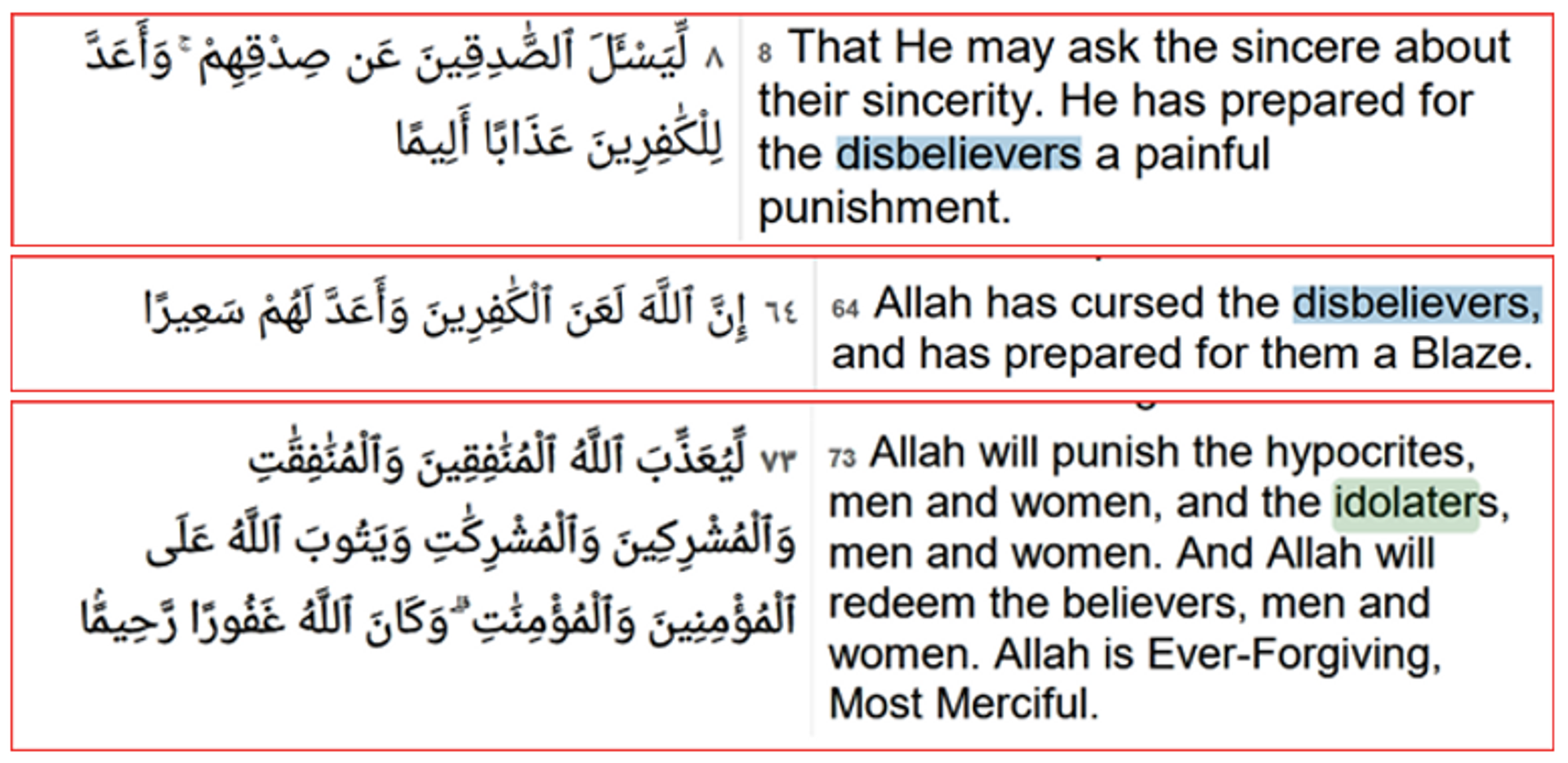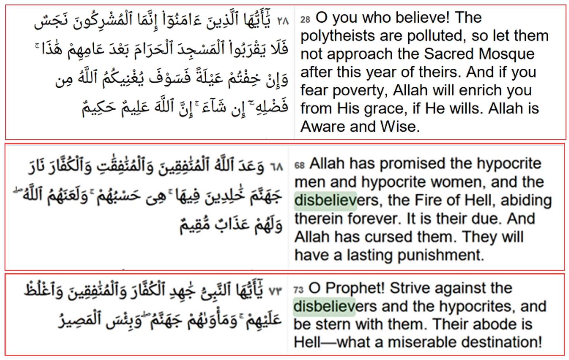 The readers are cautioned not to go by the simple and moderated English translations of the Quranic verses mentioned below, having deliberately mellowed the tone and tenor of ‘hate and incitement’ to avoid catching eyes of the laws. However, the Arabic verses are extremely divisive although some having dual meanings too; eg hateful if explained by the ultra-radical Imams and mild if explained to prove it non-intolerant.