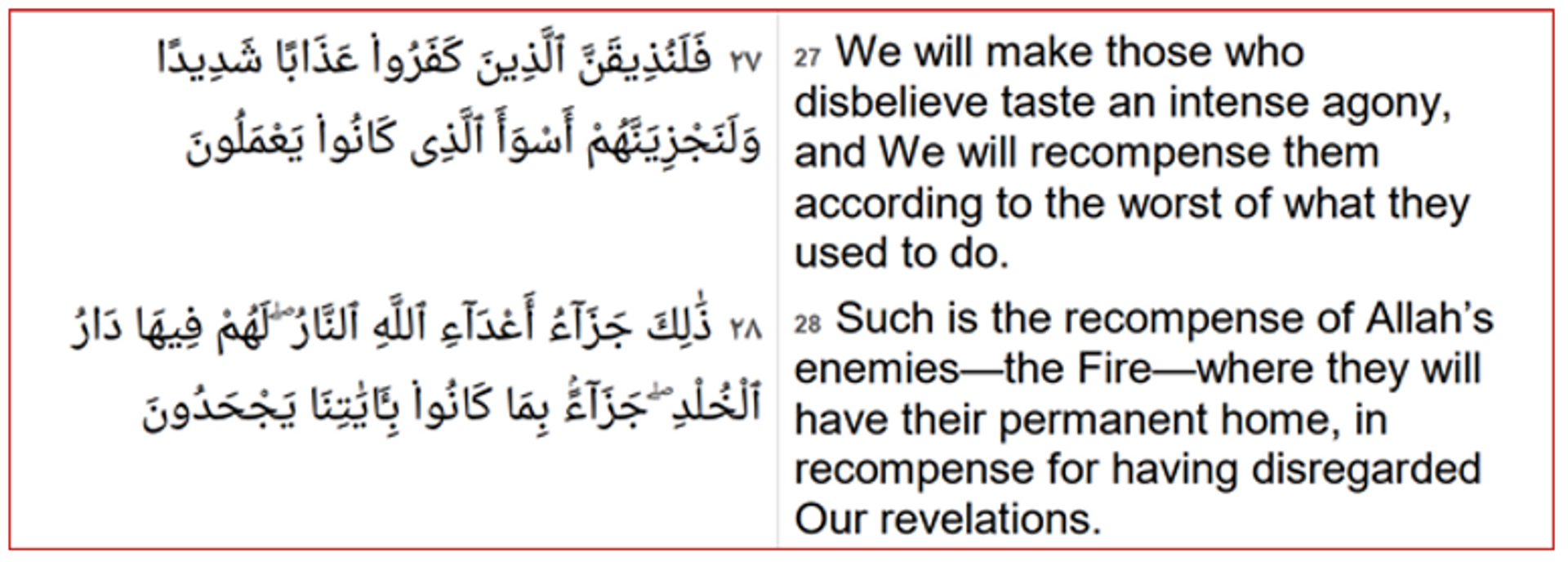 Chapter 41 (Detailed), Verses 27, 28 threaten believers of other (non-Islamic) religions/faiths of murdering in intense agony or burning in fire whom Quran quotes as disbelievers.