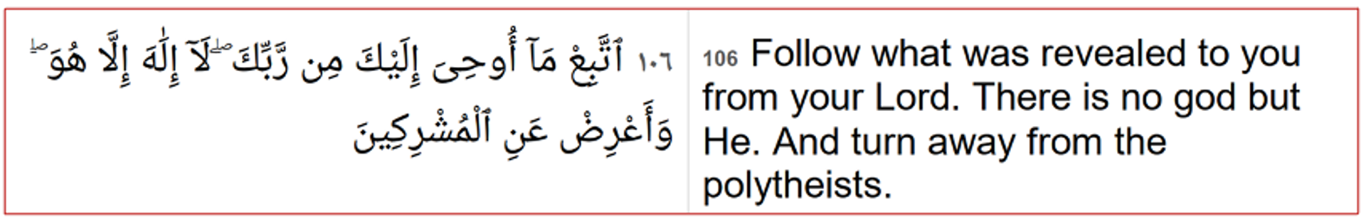 Chapter 6 ‘Livestock’ verse 106 lays down the Islamic concept that there is no other God (what polytheists believe) except Allah. This is discriminatory as Quran cannot discredit or deny the presence of various Gods that believers of other religions/faiths worship. This verse deserves to be amended.
