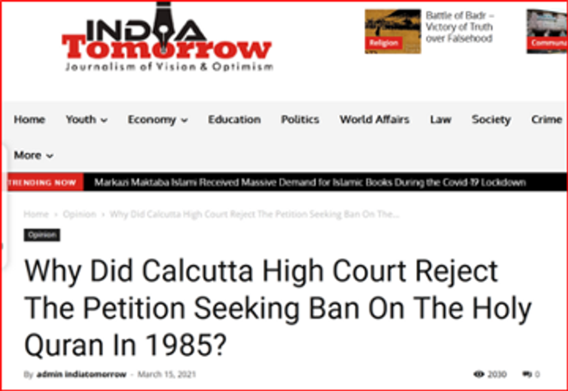 Just like the pseudo-secularist Congress party of India treats Muslims and Quran as holy cow, Indian Supreme Court and High Courts too have had knee-jerk reactions in their many verdicts on this matter. Long back, Calcutta High Court had rejected a plea in this regard in 1985 essentially because the advocate arguing the case could not lay stress on the discriminatory, hateful, intolerant and bigoted verses of Quran that impinged on fundamental rights. The High Court mentioned that it was not within the jurisdiction of the court to decide on banning the Quran or holy books of other religions; unable to visualize that it clearly impinged on the fundamental rights of non-Muslim citizens.