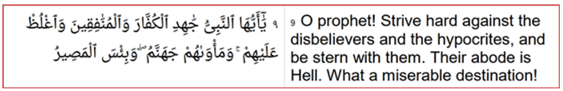 Chapter 66 (Prohibition), Verse 9 wishes hell to the believers of faiths other than Islam.